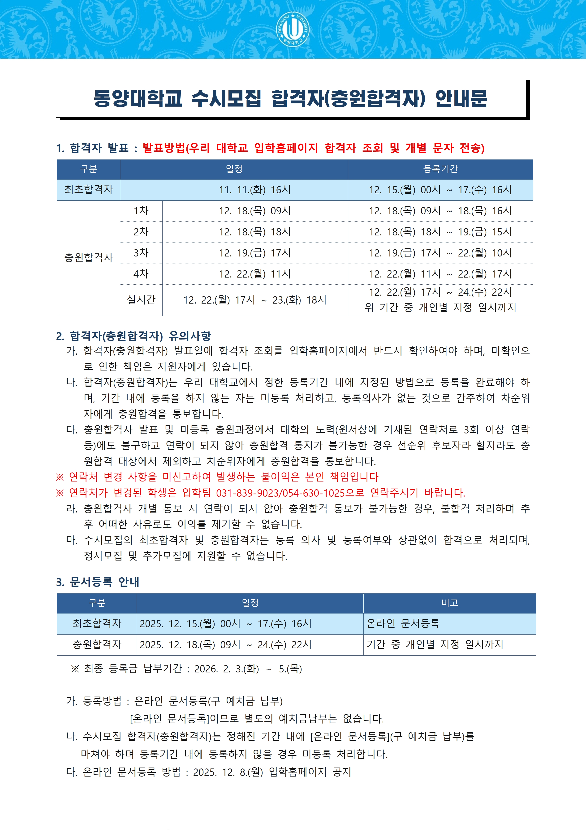 2026학년도 신입학 수시모집 합격자 발표 안내